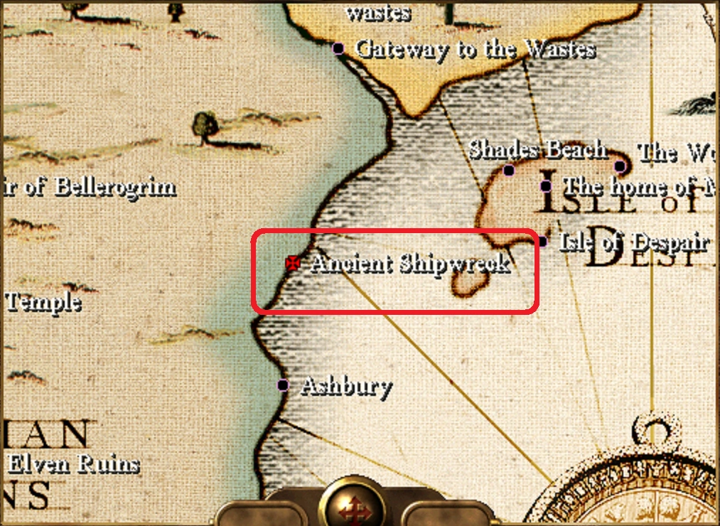 The Ancient Shipwreck is located at 498W 892S, and is marked on the player's map after successfully exploring the immediate area. The general location and nature of the site can be learned as a rumor in Ashbury.