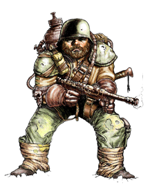 Of all the Minute Races, the Dwarven Clans are indisputably the paragon. Larger and more physically formidable than their lesser cousins, the Halflings and Gnomes, they also live longer; the natural life span of a male dwarf is nearly 600 years. Dwarves range in height from 30 inches to an extreme of 50 or so, and can weigh up to nine hundred stone, all of it muscle. They are prey to few diseases, having a constitution which can bear extremes of weather and deficiencies of diet far better than virtually any other known race. They are also highly intelligent and civilized, possess a refined artistic sensibility, and enjoy acute senses of taste, smell and hearing - faculties which all Minute persons share. In distinguishing dwarves from other Minute races, take special note of their facial hair; neither gnomes nor halflings can sport such full and luxuriant beards.