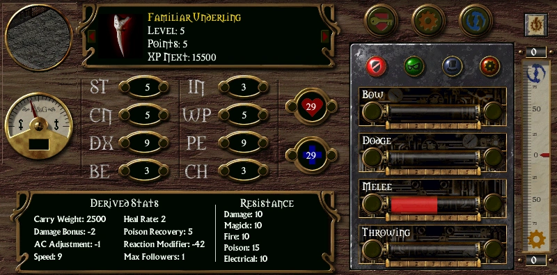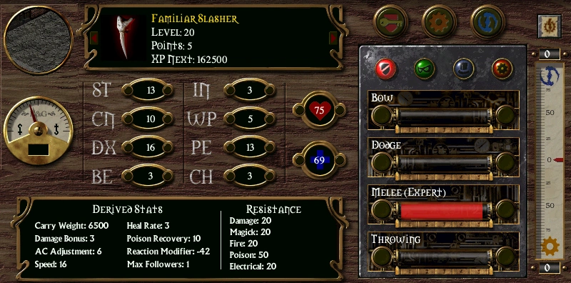 - All Familiars have 20/20 Melee, but the usable level of it is capped by their Dexterity