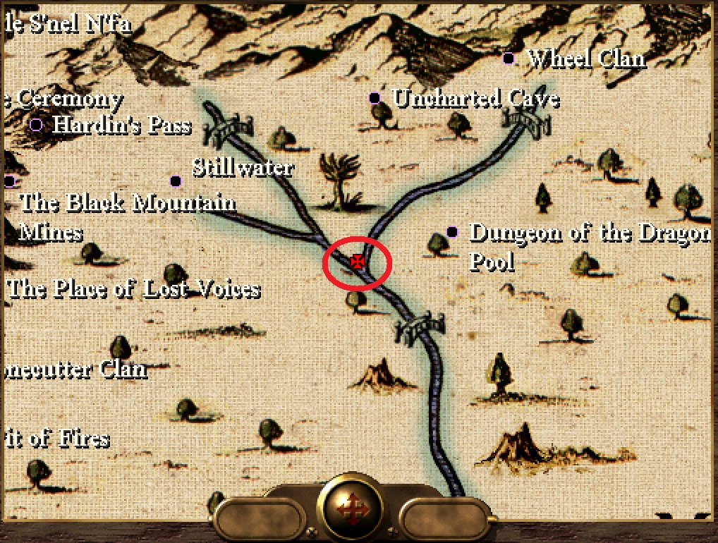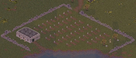 The graveyard is located 1060W 809S, at the first fork north on the main river which bisects the Morbihan Plains. It is never marked on the player's map, so one must path to the exact coordinates to access it.