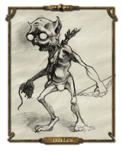 These small, upright-walking creatures possess unusually large heads, split by a gaping maw of razor-sharp teeth. They are thin-limbed and quick, and, when the need arises, they are able to move stealthily upon their heavily padded feet. Also of note is the enormity of their eyes, which is advantageous to their nocturnal nature; kites prefer to both hunt and travel at night. These dreadful little beasts habitually wear little clothing, as their skin is thick, tough and well suited to life out of doors.