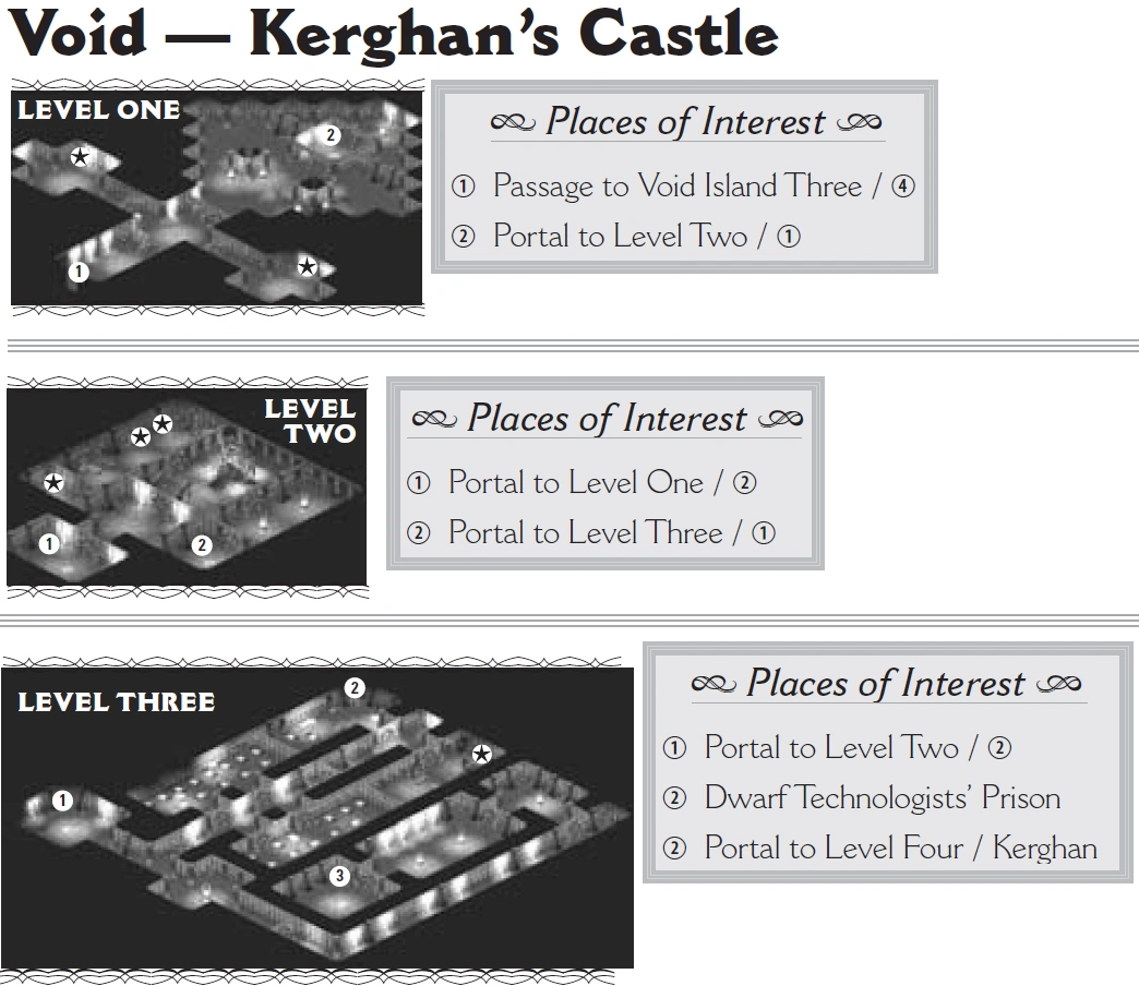 - Level 2 has Kerghan's unfinished portal to Arcanum, and portals to levels 1 and 3