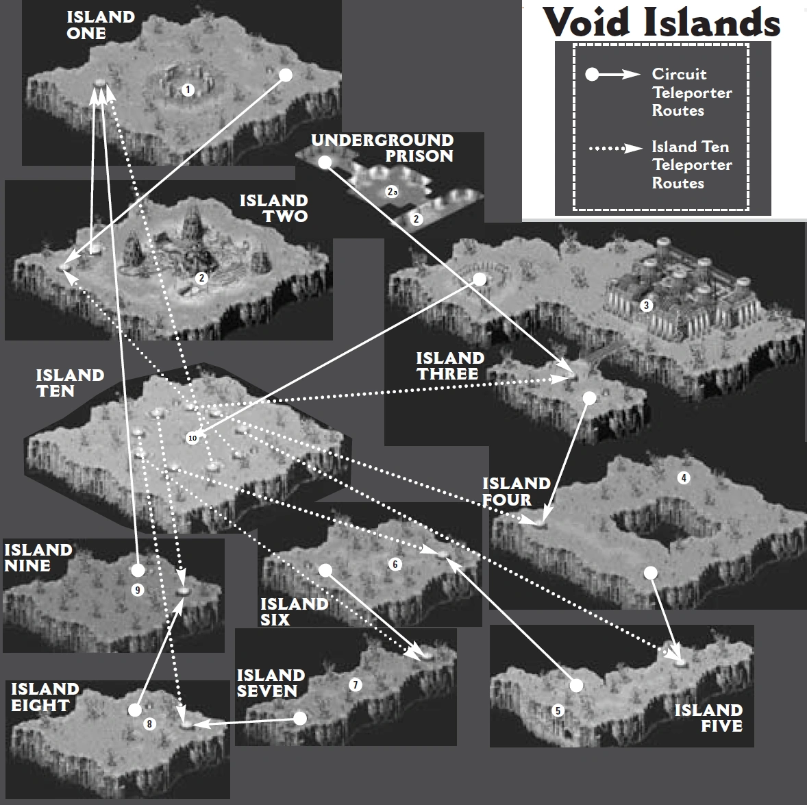 The Void is broken up in ten islands connected by a series of portals and a teleporting network. Three of the islands have a sub level.