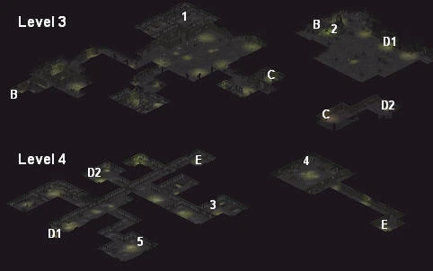 Exits: A. Exit back to the surface. B. Exit between levels 1 and 2. C. Passage. D. Exit to level 3.